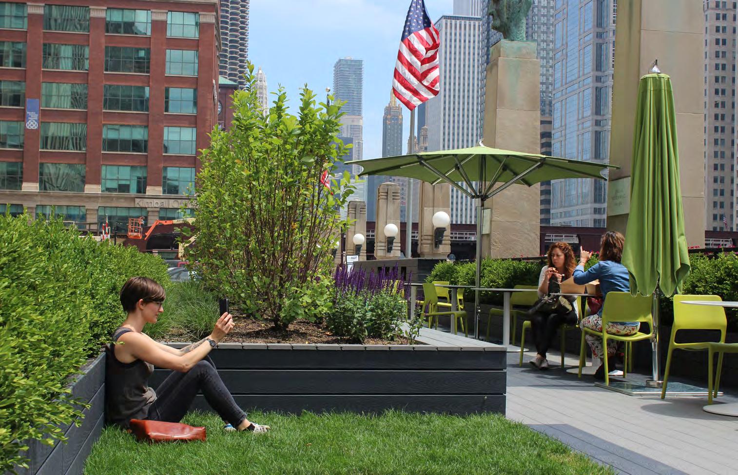 Repositioning the Merchandise Mart allowed us to consider the building’s relationship to Chicago at-large. As an experiment, we took over short-term parking spaces near the building and created a space for all Chicagoans to enjoy, with views down to the Chicago River and up to the newly reimagined Mart!