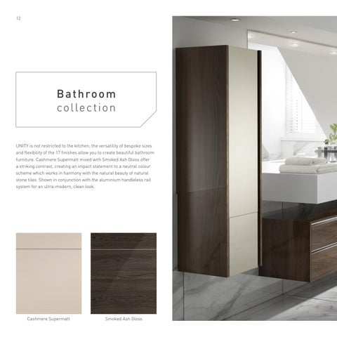UNITY is not restricted to the kitchen; the versatility of bespoke sizes and flexibility of the 17 finishes allow you to create beautiful bathroom furniture. Cashmere Supermatt mixed with Smoked Ash Gloss offer a striking contrast, creating an impact statement to a neutral colour scheme which works in harmony with the natural beauty of natural stone tiles. Shown in conjunction with the aluminium handleless rail system for an ultra-modern, clean look.