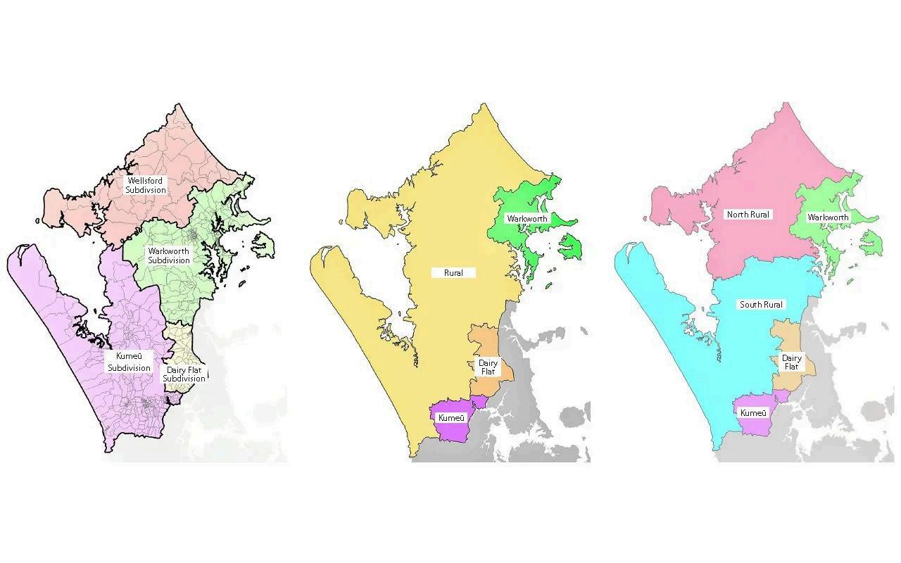 From left, existing Rodney subdivision boundaries, NAG’s preferred proposal and the option local board members ended up supporting From: https://www.localmatters.co.nz/auckland-council/board-bids-for-fairer-local-government-boundaries-in-rodney/