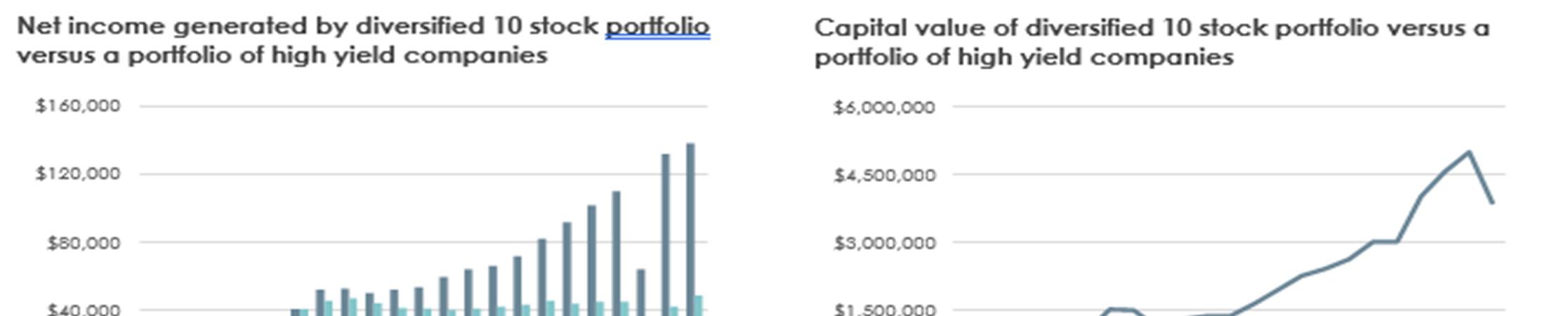 While the diversified 10 stock portfolio had an initial net yield of 4% (6% gross) versus a net yield of 5.5% (8.2% gross) for the high yield portfolio, the focus on quality over yield in the diversified 10 stock portfolio has delivered superior earnings and dividend growth (+8.9% pa) relative to the high yield portfolio (+2.7% pa).