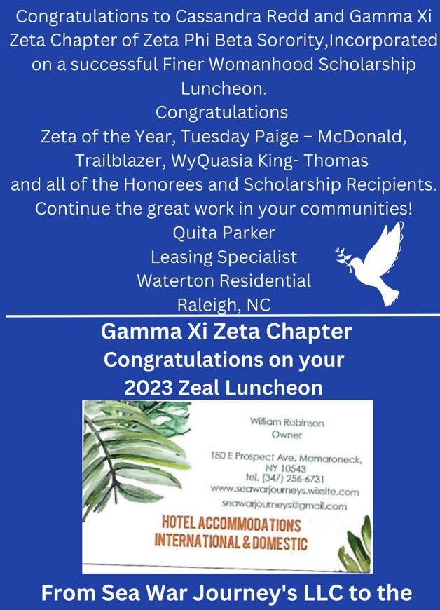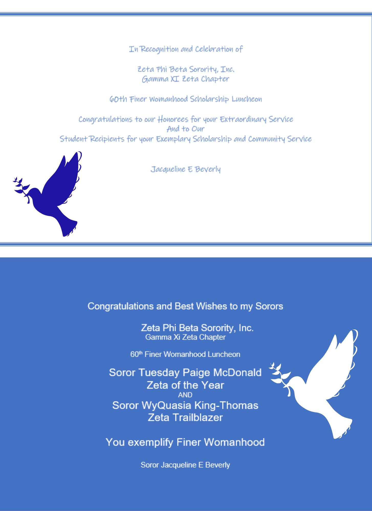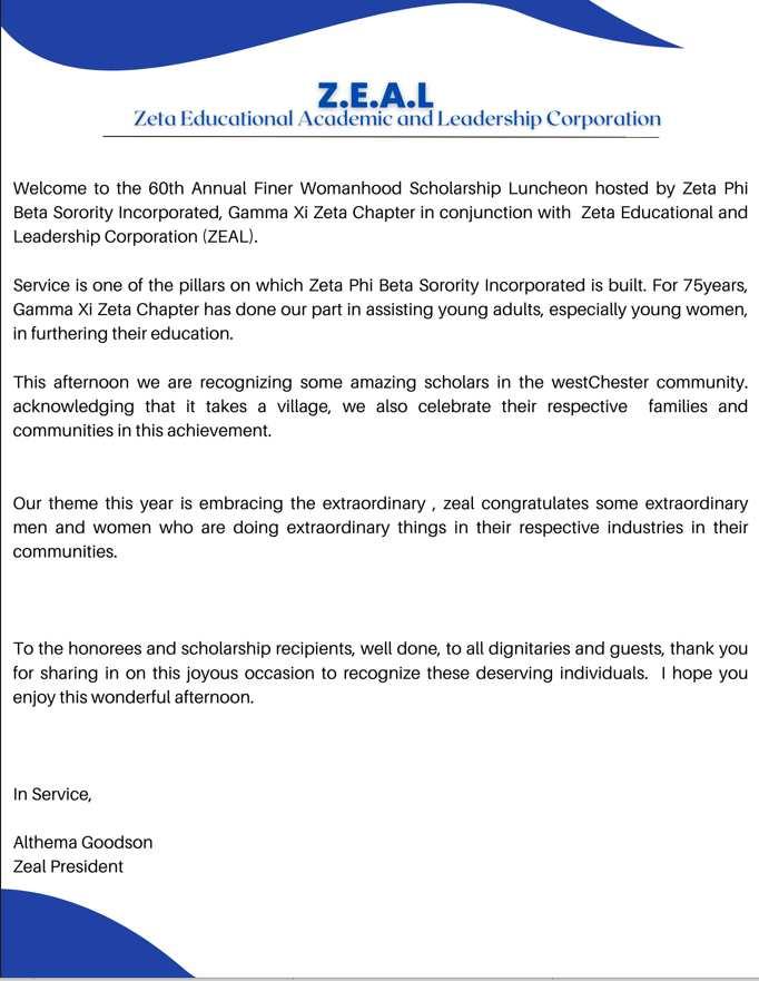AND ALL THE OTHER HONOREES OF THE 60TH ANNUAL FINER WOMANHOOD SCHOLARSHIP LUNCHEON OF ZETA PHI BETA SORORITY, INC. GAMMA XI ZETA CHAPTER/ZEAL