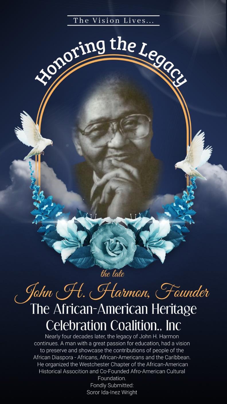 African-AmericanhereinWestchesterCountyandworldwide.HeorganizedtheWestchester ChapteroftheAfrican-AmericanHistoricalAssociation,andco-foundedtheAfro-American CulturalFoundation.ItwasthroughtheeffortsoftheFoundationthatthecountywideBlack HistoryMonthCelebrationbegan.DuringBlackHistoryMonth,aPanoramawasheldatthe WestchesterCountyCenterinWhitePlainsfeaturingdistinguishedspeakers,entertainment,and variousvendorssharinghealthandeducationinformation.Theprogramfocusthenbecamethe African-AmericanHeritageDayCelebration,oneoftheethnicculturalcelebrationsheldat KensicoDaminValhalla,NY.Now37yearslater,JohnHarmon'slegacy continueswiththe eventbeingco-sponsorbyacoalitionofAfrican-Americancivic,social,educationalandfraternal organizations,andtheCountyofWestchester.
