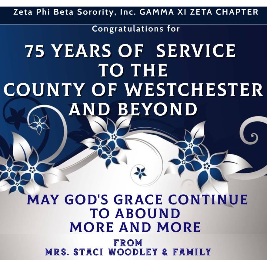 Congratulations to the finer women of Gamma Xi Zeta Chapter on 75 extraordinary years of embracing the legacy of our Founders by upholding, encouraging and supporting the highest standard of academic achievement and excellence in the Westchester community.