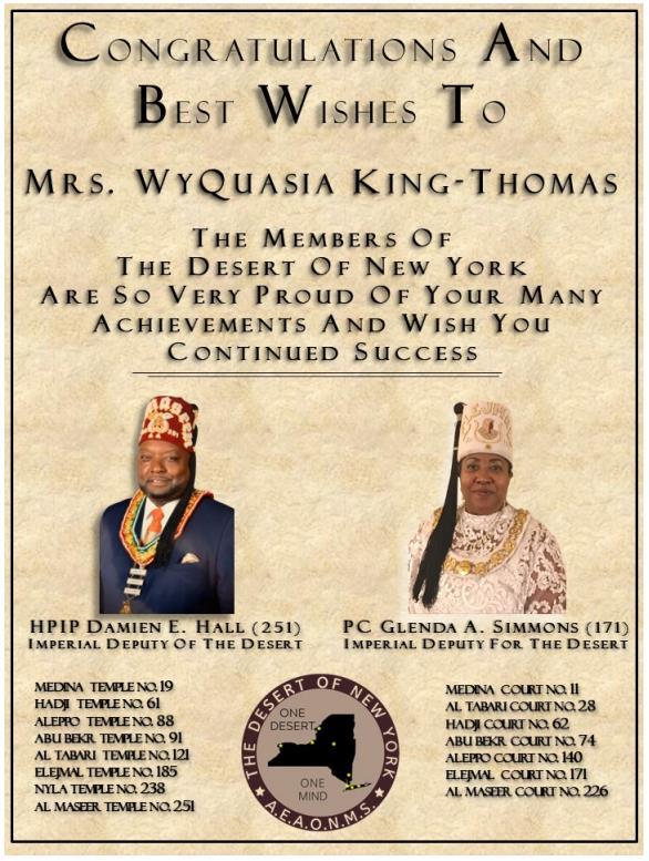 WyQuasia holds many titles in fraternal organizations as well. WyQuasia is a member of Zeta Phi Beta Sorority Incorporated, Gamma Xi Zeta Chapter in Westchester County, NY. She is a Past Matron of Ruth Chapter #8, and currently serving as District Deputy Grand Matron of Eureka Grand Chapter, Prince Hall Order Eastern Star Incorporated, State of NY and Past Grand Queen of Emmett J. Avery Grand Court Ladies of The Circle of Perfection. She is a Past Illustrious Commandress of Elejmal Court #171 - Imperial Court Daughters as well as Royal Lady of Magdalene Court #12, Order of Cyrene.