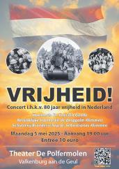 Op 5 mei 2025 vieren we in Nederland 80 jaar vrijheid. Harmonie St. Caecilia Geulle en Koninklijke Harmonie de Berggalm Klimmen bundelen voor deze speciale gelegenheid hun muzikale krachten. Het beloofd een unieke samenwerking te worden waarbij meer dan 100 muzikanten het podium zullen betreden. Zij laten u horen hoe muziek uiting kan geven aan grote historische gebeurtenissen en tegelijkertijd het kleine persoonlijke geluk kan vertolken. Naast de twee orkesten zullen ook Vlaamse acteurs en de drumband van Schutterij Broederschap Sint Sebastianus Klimmen hun medewerking verlenen. Al met al een beleving die u niet mag missen! Wij zien u graag terug op 5 mei in de Polfermolen te Valkenburg.