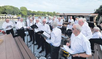 Om kwart voor zes vertrokken we per luxe touringcar vanaf station Meerssen. Rond zeven uur gingen we met zijn allen – op één na – aan boord. De microfoons werden gericht zodat ons gezang ook op de kades goed hoorbaar zou zijn. Onze penningmeester miste op een haar na de boot, maar wist net op tijd nog de sprong van wal naar schip te maken.