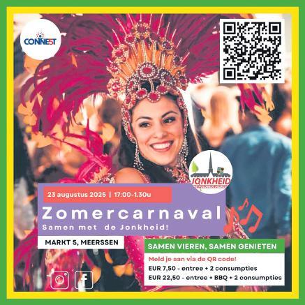 Zomercarnaval & BBQ i.s.m. Jonkheid | Za 23 aug Zin om te feesten aan het einde van een heerlijke zomervakantie? Vrienden treffen, zomerverhalen en nieuwe plannen delen! Samen met de Jonkheid vieren we het einde van de zomer op de leukste manier: Zomercarnaval - met een vleugje Latin vibes, lekkere drankjes en een heerlijke BBQ in gezellige Meerssense sfeer. Mis het niet en schrijf je nu al in! Met dit evenement steun je de activiteiten van de Jonkheid en Stichting Connect5.