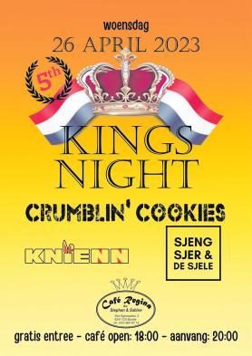 Woensdag 26 april 2023 is het, na een pauze van 3 jaar, eindelijk weer zover. Kings Night Bunde 2023; de 5e editie van deze gezellige muzikale avond bij Café Regina, Sint Agnesplein 3 in Bunde. De line-up bestaat uit de Crumblin’ Cookies, Knienn en Sjeng, Sjer & de Sjele.