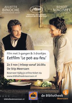EETFILM LE POT-AU-FEU | Film & 3-gangen menu | Zo 3 nov Wat is er leuker dan de eetfilm ‘Le pot-au-feu’ te kijken en tussendoor te genieten van een heerlijk bijpassend 3-gangen menu? De Vrienden van de Bibliotheek Meerssen verzorgen weer een gezellige eetfilm. Liefde en passie voor koken en eten staan centraal in deze bloedmooie ode aan de klassieke Franse keuken, met hoofdrollen van Juliette Binoche en Benoît Magimel. Het is 1885. De uitmuntende kok Eugenie werkt voor de beroemde fijnproever en levensgenieter Dodin Bouffant. Hun samenwerking resulteert in verrukkelijke gerechten die zelfs de bekendste chef-koks ter wereld verbijsteren. In de loop der jaren is vanuit hun wederzijdse passie voor het koken een romantische relatie ontstaan. Maar Eugenie hecht waarde aan haar vrijheid en heeft nooit de wens gehad om met Dodin te trouwen. Dus besluit hij iets te doen wat hij nog nooit eerder heeft gedaan.