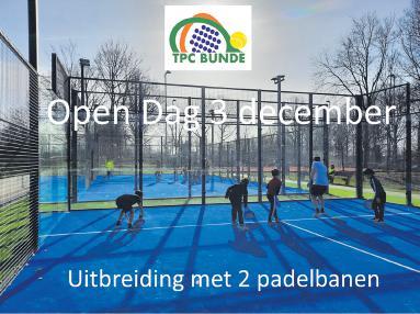 Op zaterdag 3 december 2022 organiseert TennisPadelClub Bunde een Open Dag van 11.00 tot 13.00 uur. Iedereen heeft het te genwoordig over ‘padel.’ Wil jij nu zelf eens zien en uitproberen wat ‘padel’ is, dan ben je van harte welkom op onze Open Dag. Met de bezettingsgraad van de huidige twee padelbanen kunnen wij als vereniging niet meer voldoen aan de vraag van onze leden. Daarom heeft het bestuur in de Algemene Ledenvergadering van 11 oktober 2022 de uitbreidingsplannen met nog twee padelba nen voorgelegd aan de leden. De 80 aanwezigen stemden bijna unaniem vóór deze uitbrei ding.