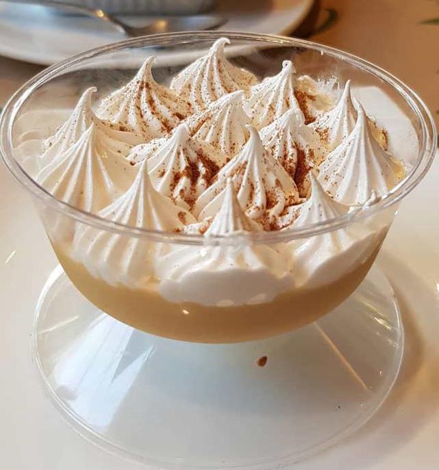 5.Finalmente se coloca el manjar en un envase para servir y sobre este mismo colocamos el merengue y la canela en polvo.