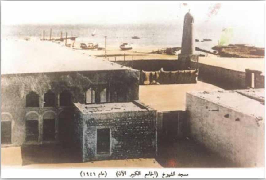 A photograph of the original Al Shoyoukh Mosque structure in 1946 as part of the Emiri Diwan complex before its renovation in 1959 (Credit: Al Sharq newspaper, 13 June 2017)