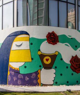 Qatari muralist and graffiti artist Mubarak Al Malik, whose murals were also showcased at Art Basel in Miami in 2021,7 was also commissioned by JedariArt to showcase his distinctive, colorful style along the streets of his hometown of Doha. Al Malik’s cartoon-like figures can be found across various locations in Doha, including Al Abraj Park and cultural hub Fire Station. Figure of a Woman Wearing Batoola and Holding Mubkhar,6 located at Al Abraj Park, symbolizes the welcoming atmosphere of the country by depicting a Qatari woman donning a traditional golden face covering and holding an incense burner with a red heart on it. Typically lit on special occasions or when