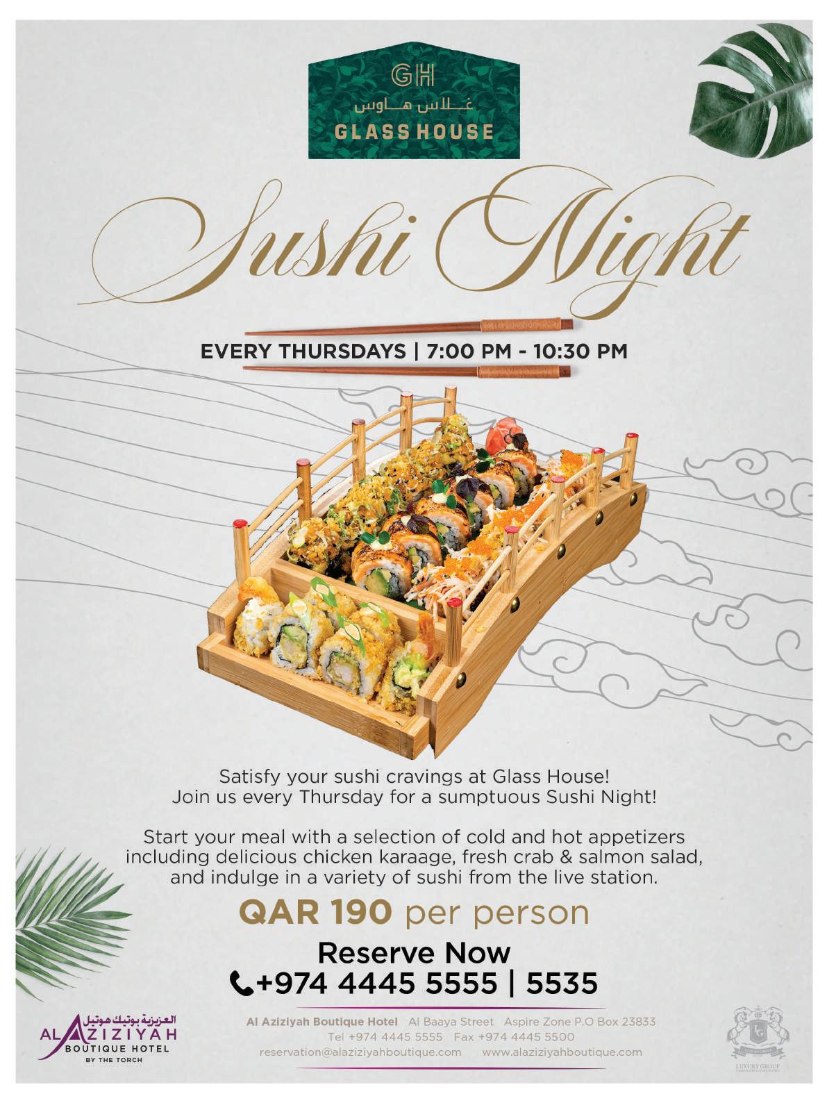 Indulge in an assortment of mouthwatering sushi and meat complemented with soft beverages every Saturday. Priced at QR199 per person. Sharing menu for a minimum of 2 people. Available every Saturday, from 7pm to 11pm.