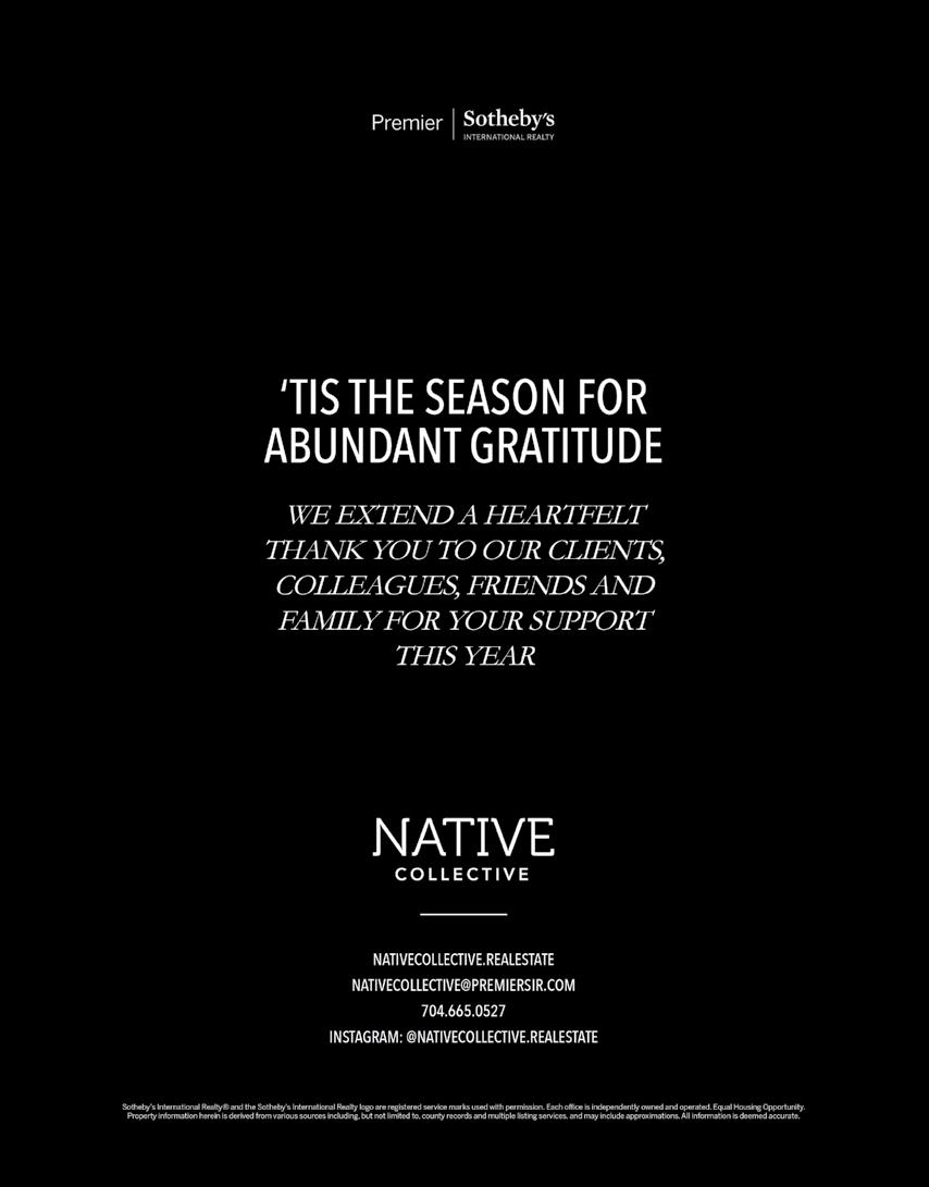 The holidays are already here? Boy, did that happen quickly. I was just sit ting at the beach in 90 degrees at the Outer Banks...or at least that's what it feels like. But those dog days of sum mer are months behind us, and after a vibrant fall in Carolina, it is now ev eryone's favorite time of year. And for this holiday issue, we wanted to focus on five seasonal topics: desserts, phi lanthropy, holiday trips, festive towns and where to shop local this season. On top of all the holiday Exclusives we also share the best New Year's events here in Charlotte, we sip sev eral cocktails including a delicious one from the popular Supperland, and we eat at the farm-to-table restaurant Heirloom! In our Arts and Culture sec tion we see Jena Gerena's stationary art, see some amazing fashion at the Mint, visit the Van Every/Smith gal leries, and view the sculptures of Kelly Sheppard Murray. In our home section we meet interior designer Marisa Wil son, see a holiday bar setup from Lisa Sherry, a Christmas gathering space from Delphinium Design, and a fes tive table setting from Traci Zeller. We also tour a beautiful custom home built by Arcadia and designed by the talent ed designer Kendra Tardif White of Pheasant Hill Designs. We also experi ence the holidays in Pinehurst, South ern Pines, and Moore County as well as cruise to the Lowcountry to enjoy a stay at the French Quarter Inn. We hope you enjoy, and we will see you in 2023. Wow, that sounds so weird, 2023! Happy Holidays everyone.