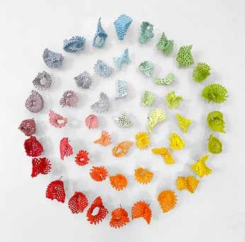 Although originally trained as a sculptor, Murray had strayed from this medium, instead dedicating her time to two-dimensional media until 2016 when she began her yearlong one-sculptureper-day mission. Initially, each day’s work was distinct from the previous day’s creation, departing in color or shape or both. However, in the past two years, Murray has begun to intentionally relate pieces to one another, resulting in specific groupings and series united in concept or other qualities.