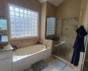 Meanwhile, the main bathroom has been turned into a serene retreat Ashley wanted an oasis after each exhaustive day Featuring an elegant combination of white and baby blue Cloe tile, a frameless glass shower, and a vaulted arched window that bathes the room in natural light The tub surround was extended to serve as a bench in the shower Herringbone floors and dual custom shaker vanities complete the look, combining both style and functionality