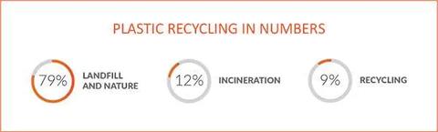 Out of all the plastic manufactured, only 9% gets recycled. 12% is incinerated for energy, and 79% goes to landfills or nature. It is estimated that by 2050 there will be more plastic in the oceans than fish The majority of non-recyclable plastic waste comes from not being able to separate different plastic types from each other reliably.