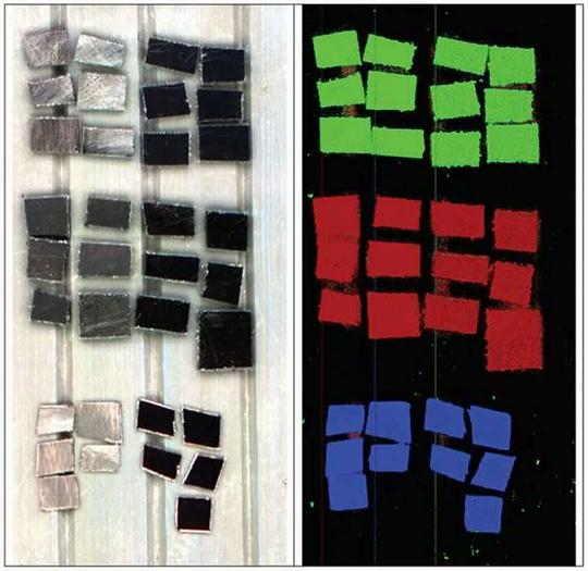 Pictured is an example of black plastic sorting measured in a laboratory with a Specim FX50 hyperspectral camera. Twelve pieces of ABS and PE were measured together with ten pieces of PS (34 altogether). For each sample group, half of the samples were shiny, and the second half with diffuse surfaces. The figure below shows that samples made of ABS, PS, and PE could be accurately sorted with the Specim FX50