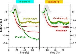 Fig.1 Normalized spin moment as a function of time (in fs) in laser pumped FePt. The moment is calculated in presence of phonon modes as well as in absence of any nuclear motion.