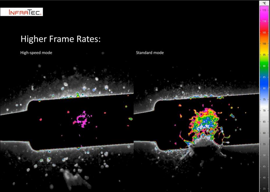 If you want to analyse the thermal behavior of objects and processes from a wide variety of perspectives, you can use the high-speed mode for maximum flexibility. This function allows the camera to be used in two different operating modes. The standard mode suits best for depicting the smallest geometrical details This allows users to record images with the native number of pixel of the camera detector. Switching to high-speed mode opens up the option of more than triple the frame rate, while the field of view (FOV) remains identical. This enables for most accurate time monitoring of fast processes At the same time, the thermal resolution increases by a factor of 2 in high-speed mode, which additionally improves the analysis of temperature differences.