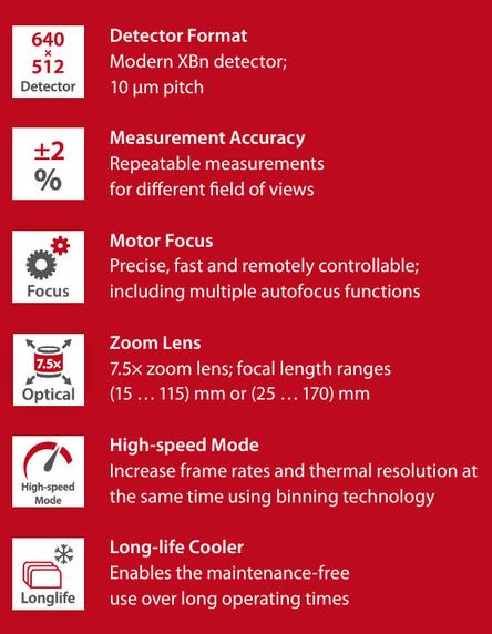 The thermal resolution of the ImageIR® infrared camera series allows you to measure smallest temperature differences of better than 0.03 K (at 30 °C)