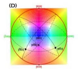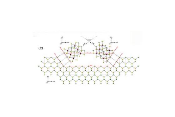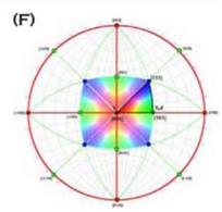 (E) orientation relation between GaAs-matrix and the completely embedded (Mn,Ga)As crystallite & (F) stereographic projection of cubic GaAs