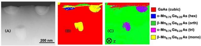 A careful inspection of the PED diagrams on the precipitates showed that there existed super structure reflections not consistent with MnAs bulk structure. ASTAR template matching analysis with all possible templates of 4 possible phases compatible with Mn₀.₇₅Ga₀.₂₅As (total 38561 templates) shows a coexistence of precipitates with the monoclinic β-phase (space group P2,/m) and of precipitates with the hexagonal α-phase (P6,/mmc) at room temperature An example of ASTAR phase and orientation analysis of the embedded (Mn, Ga)As-crystallite precipitates in GaAs is illustrated below.