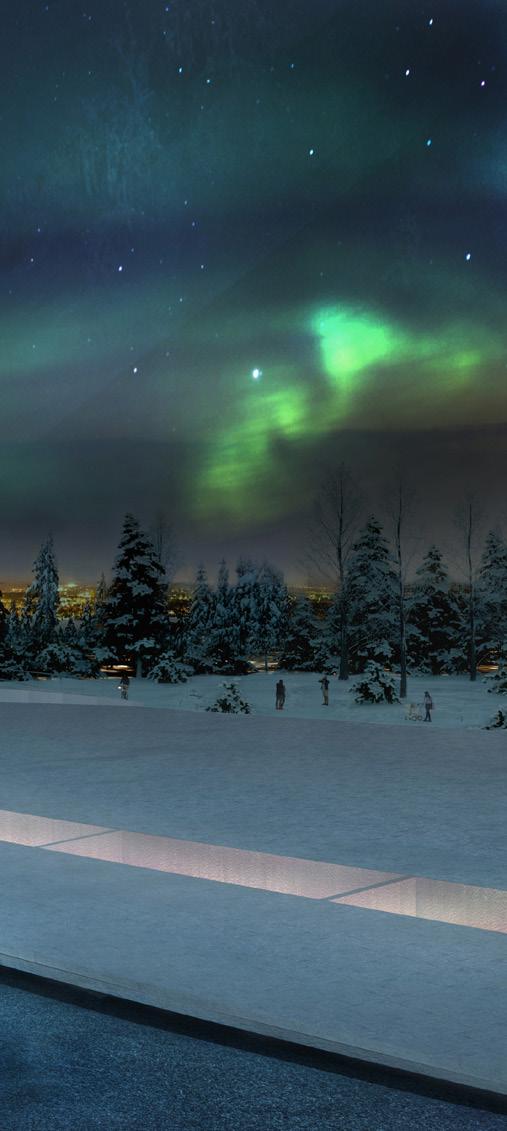 thinner ribbon is reserved for guests to the resort, accommodating generous hotel rooms with private sauna. The dynamic volume responds metaphorically, the ethereal movement of dancing Northern Lights. Fluidity is also expressed in the arrangement of interior circulation. provided at the intersection to allow visitors to refresh and recharge before embarking on their journeys. As the two ribbons pull apart a landscape, the building itself is Revontulet frozen in time.