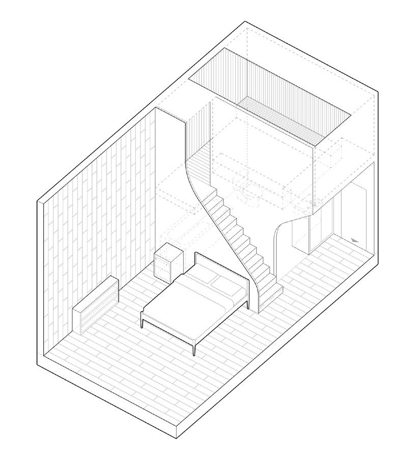 Clusters consist of various combination of SROs and full flats. On the west side, there are small, intimate pockets of shared spaces among SROs facing the 2nd Ave. The middle zone lie the mechanical, utilities and cores. On the east side, large double-height shared spaces open to the garden view and can turn into an outdoor patio. The shared spaces keep a west-to-east visual transparency to allow more visibility of the garden.
