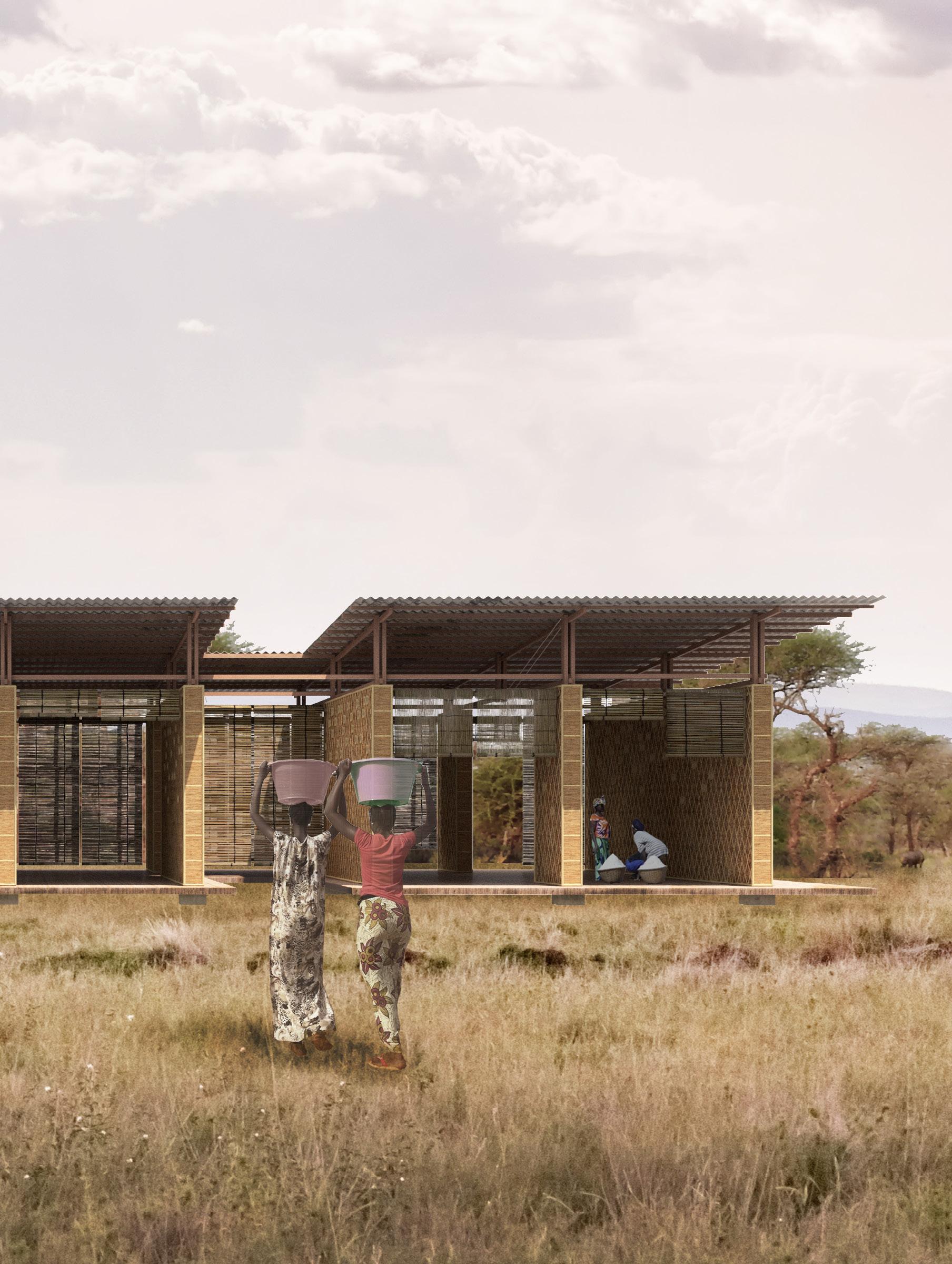 The building uses affordable and locally available materials and simple tectonics that allow easy assembly, maintenance, and disassembly. The permanent walls are built with straws bales sandwiched by wild bamboo sheets. Local fabric hangs between two adjacent walls as temporary spatial partitions. The inclined metal roof is elevated from the walls, allowing natural ventilation to cool down the built environment. The easily replicable manufacture and modular spatial diagram allow the space and structures to aggregate laterally in the adaptation of future needs.