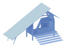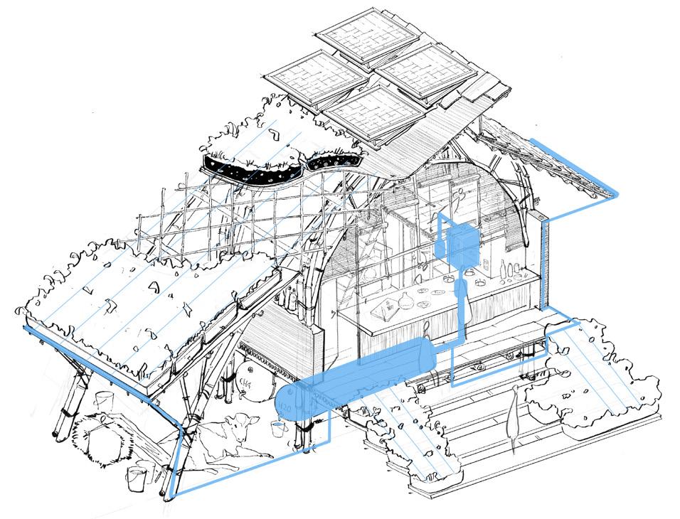 The climate in Guatemala is consistently warm and humid throughout the year. The site location on a hill frees us from the concerns of bugs and the need for a complete enclosure. The extended roof provides a surface for rainwater harvesting and micro-farming. It also creates a shaded and breezy outdoor passage underneath, which can be used as a cattle shed.
