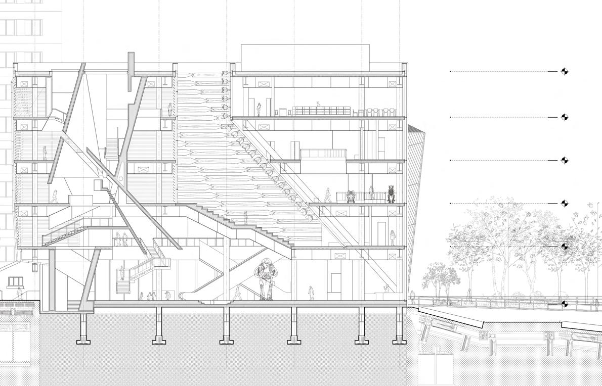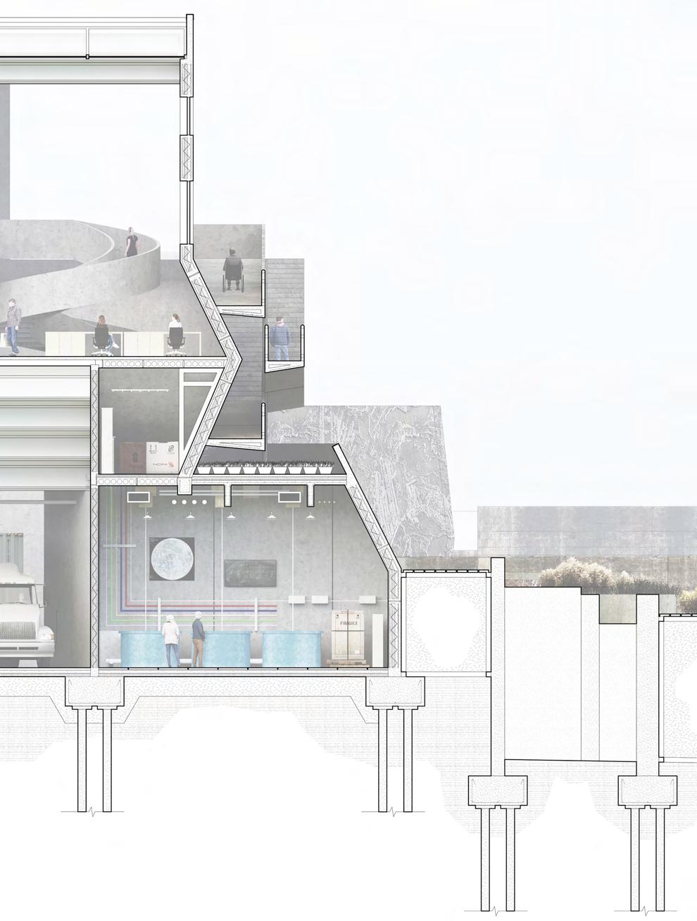Our design for the NOAA marine laboratory at Sandy Hook, New Jersey, focuses on integrating ecological preservation, functionality, and local heritage. The chosen site, an existing developed area influenced by tidal changes, includes an aging seawall with structural instability that threatens nearby buildings. To resolve this, we redesigned the seawall with an extended cross-section and roughened surface, enhancing its ability to absorb wave impacts while creating habitats for marine species like rockweed, which thrives in tidal environments and adds ecological value.