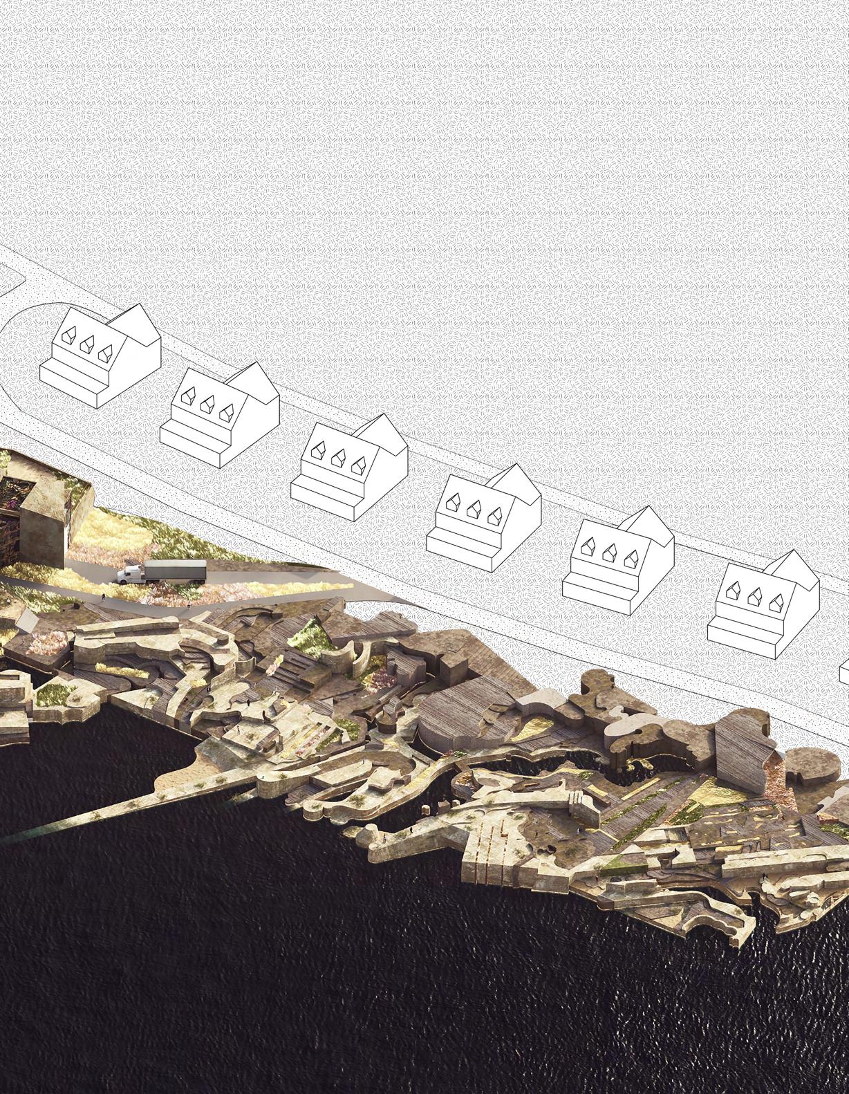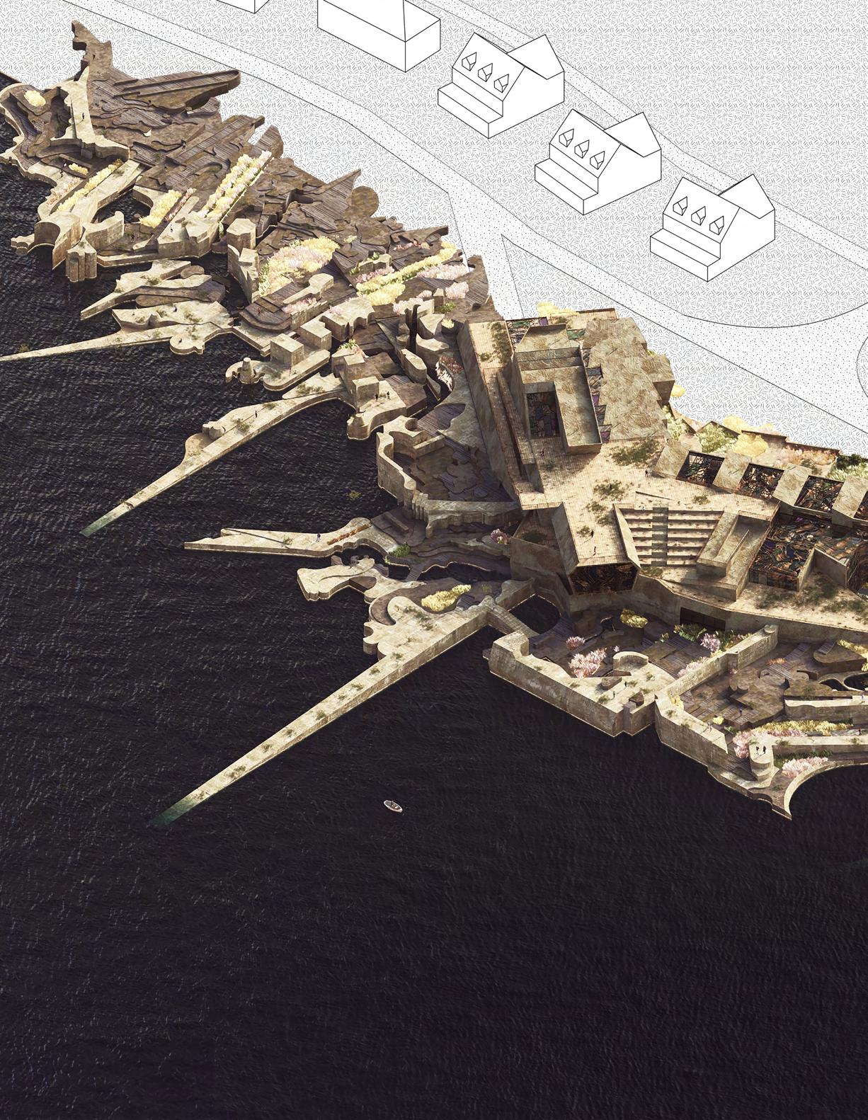 AI-assisted analysis reinterprets existing coastal site features and translates them into three-dimensional modules that form the building’s seawall system, integrating ecological function with coastal performance.