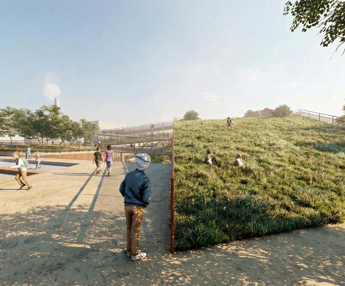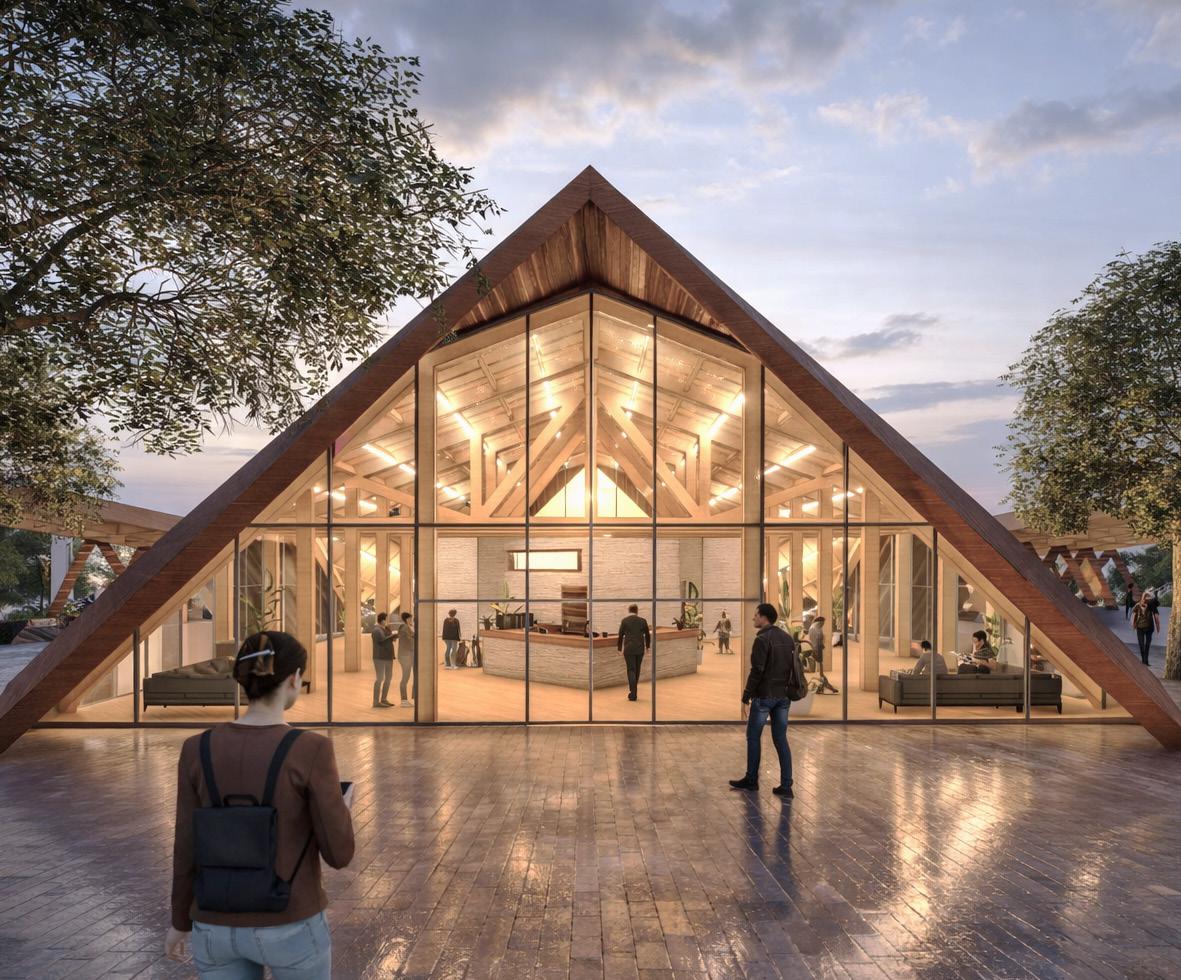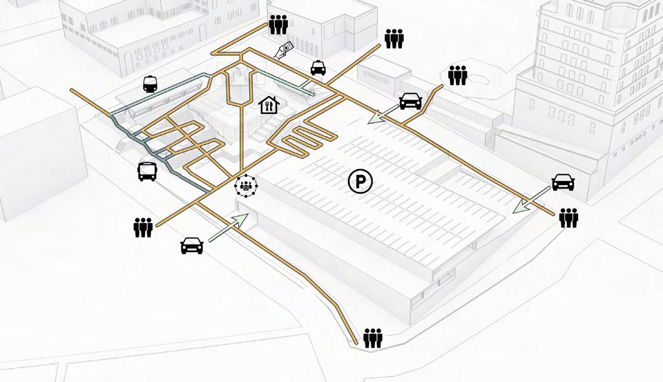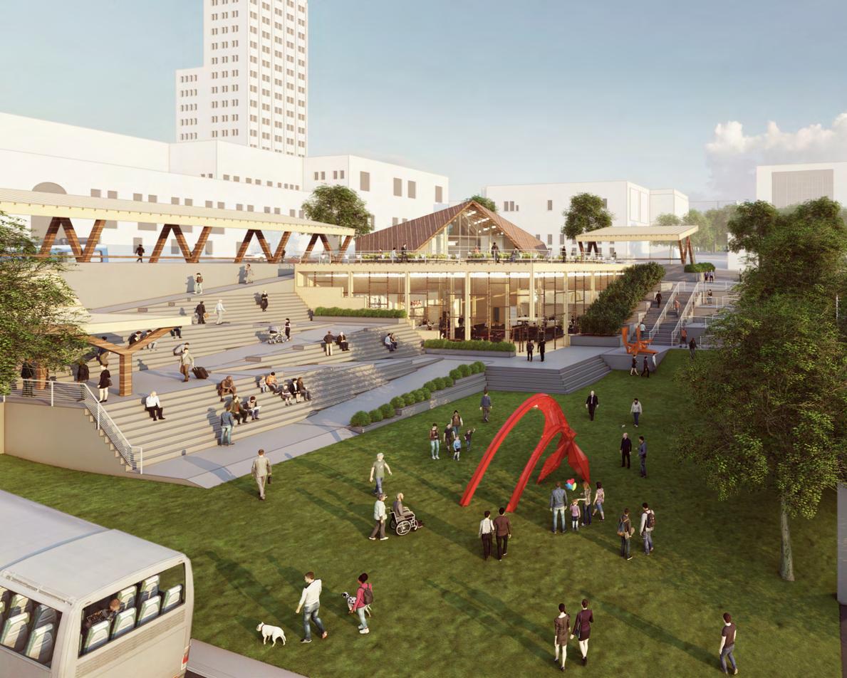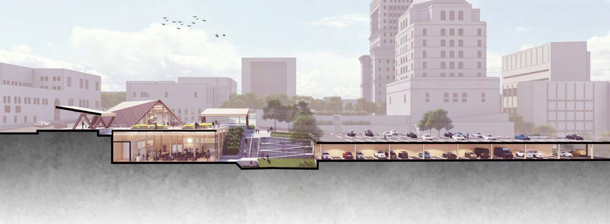 The project aims to transform an existing parking lot into a transit hub that maintains the same parking capacity while fully leveraging the site’s topography.