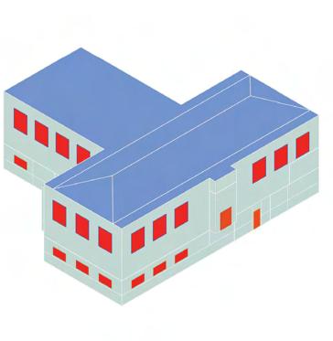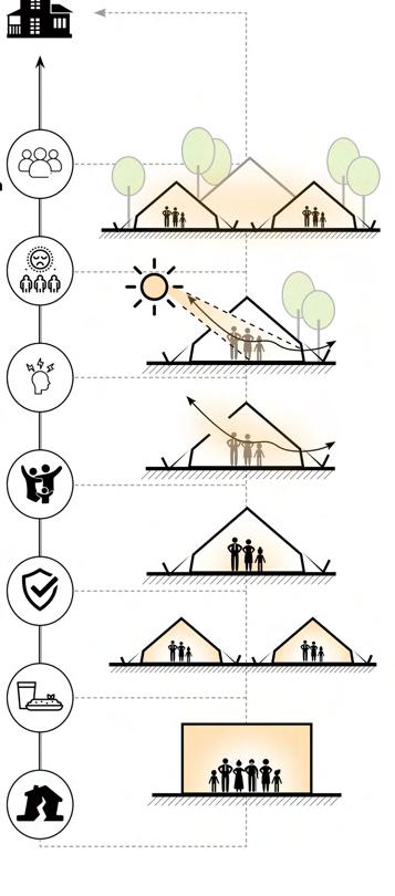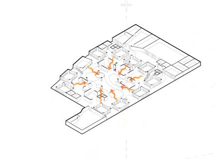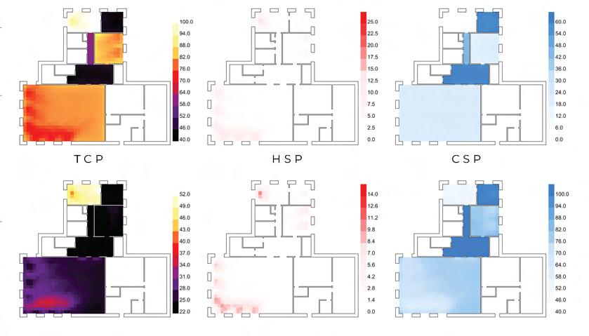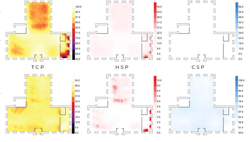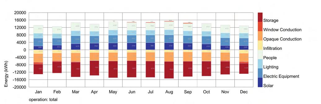 The atrium maximizes winter solar gain through a large operable skylight with high-transmittance double glazing. Sunlight is absorbed by the central atrium, allowing heat to gradually disperse into adjacent spaces. This establishes a “thermal onion” effect, where the atrium functions as a warm core, generating a passive heating gradient that enhances thermal comfort and energy efficiency.