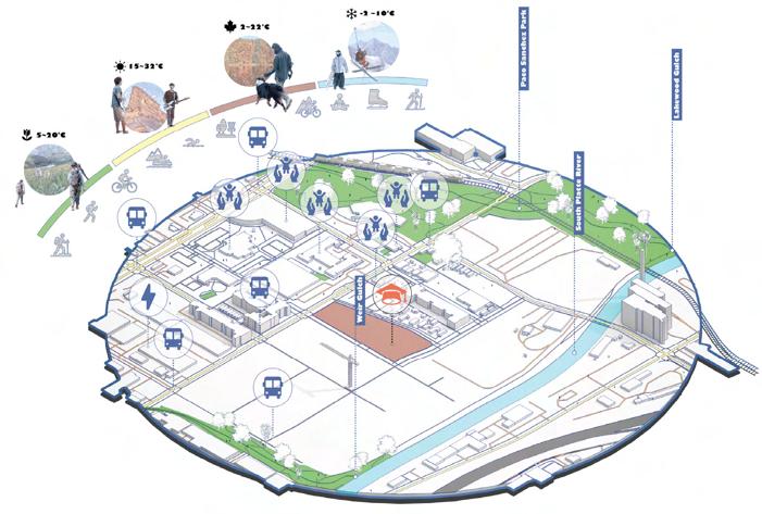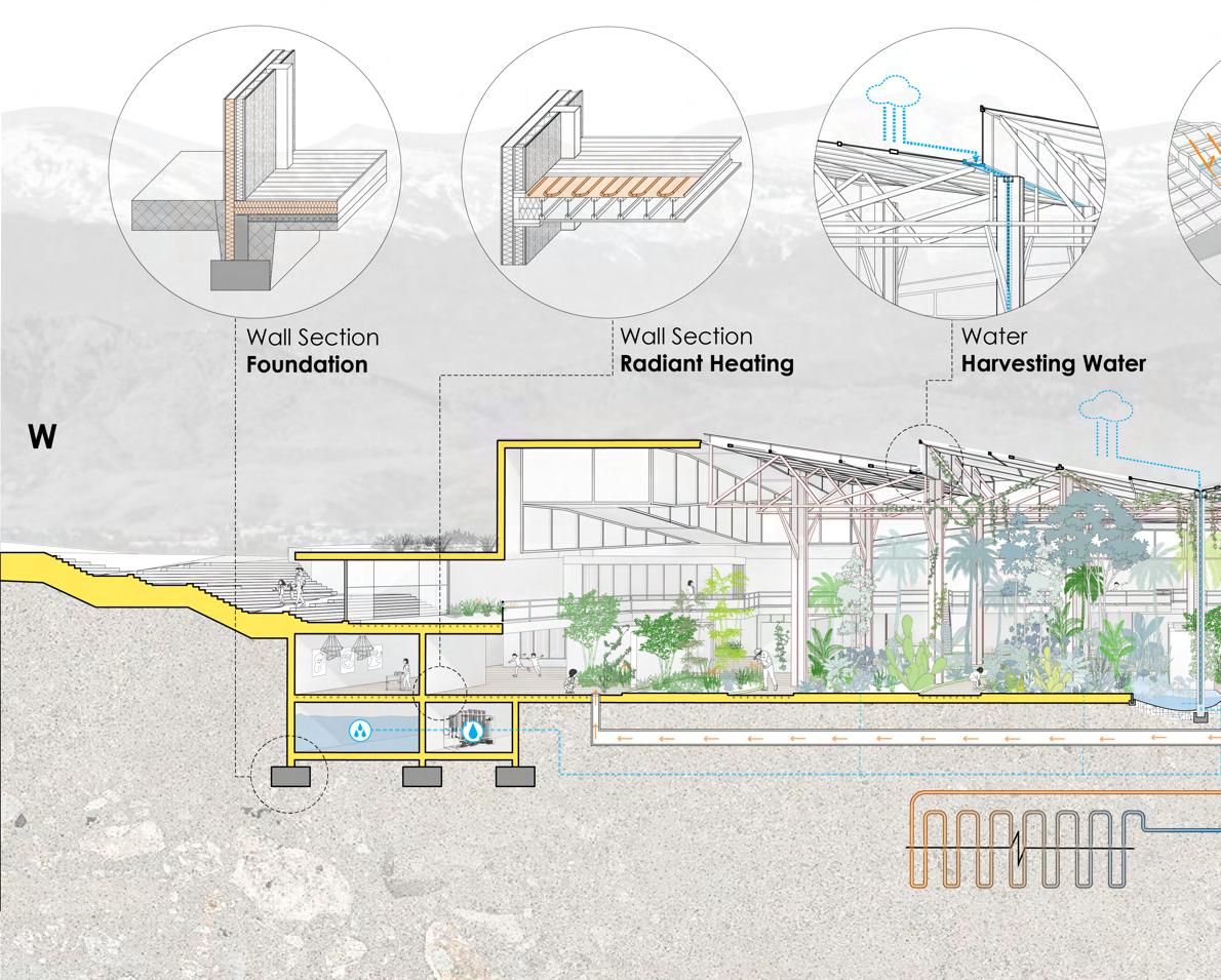 Denver’s long heating season presents a critical environmental challenge. To address this, the building is partially embedded in the ground, using soil thermal mass as a passive buffer to stabilize indoor temperatures. Earth tubes precondition incoming fresh air through stable underground temperatures, reducing ventilation-related energy demand, while geothermal systems further support renewable subsurface energy use.