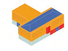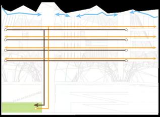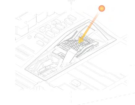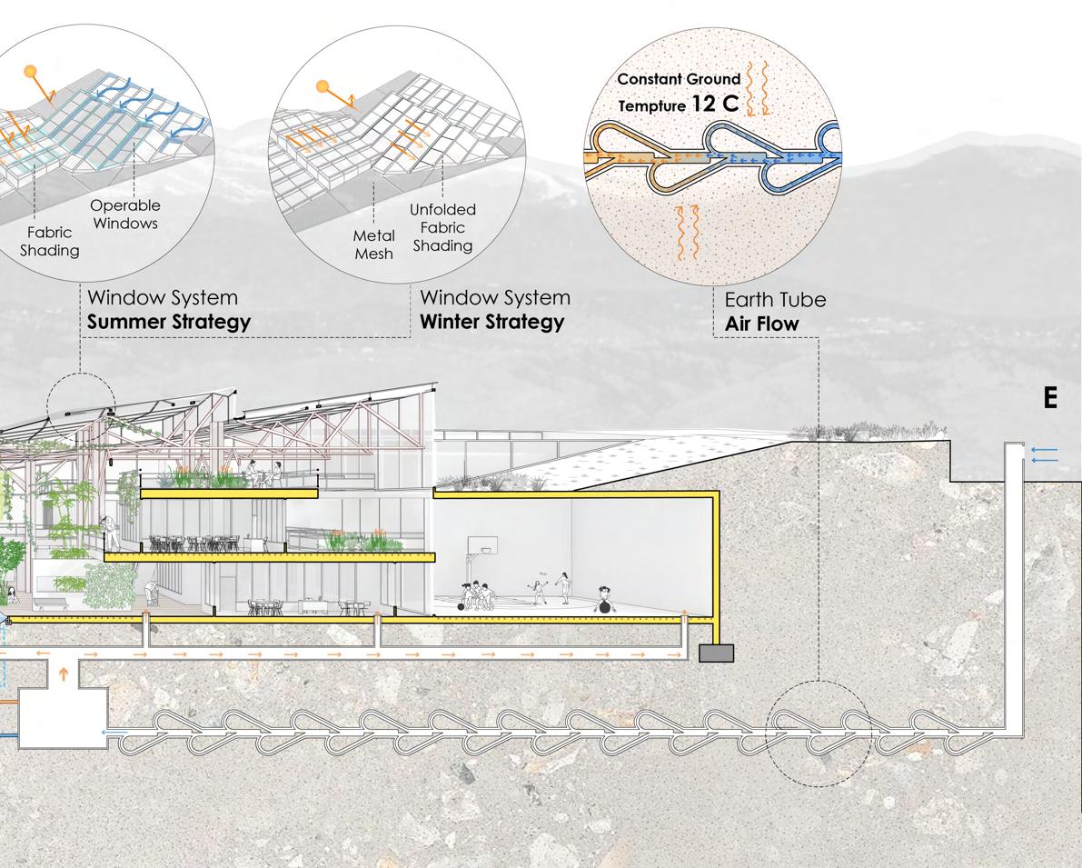 A glazed roof is introduced above the central garden to regulate daylight and solar heat gain. The operable glazing allows controlled solar penetration, enabling the atrium to function as a thermal core—absorbing heat and daylight during winter while moderating excess gain in warmer periods. Together, the sunken mass, earth tubes, and glazed roof establish a layered thermal strategy that integrates environmental performance with learning space design.