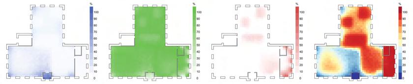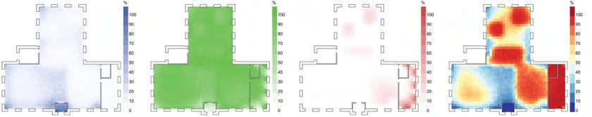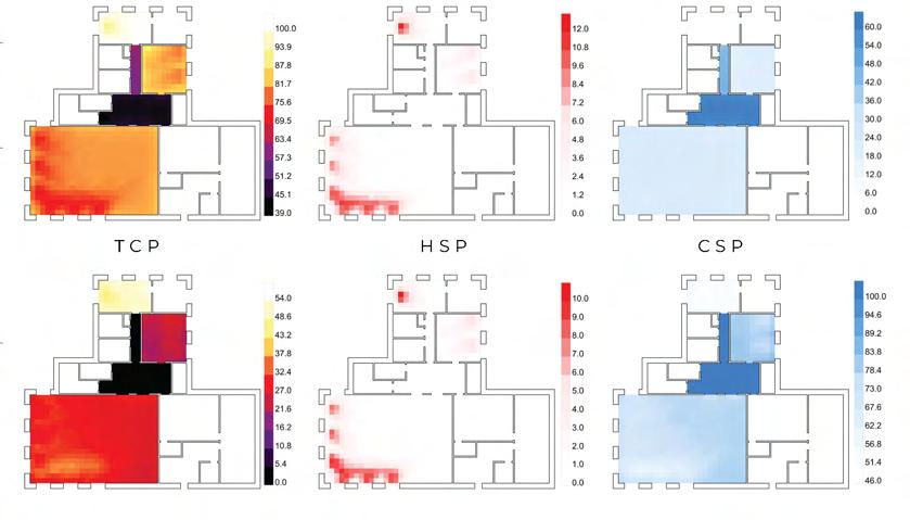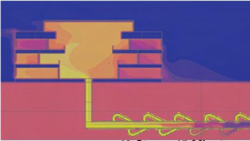 Under limited sunlight conditions, underfloor heating is activated within individual rooms to maintain indoor comfort Heated floors act as localized thermal sources, radiating heat outward into surrounding spaces. This produces a reversed “thermal onion” effect, in which each room becomes a thermal core, forming layered thermal gradients that improve thermal
