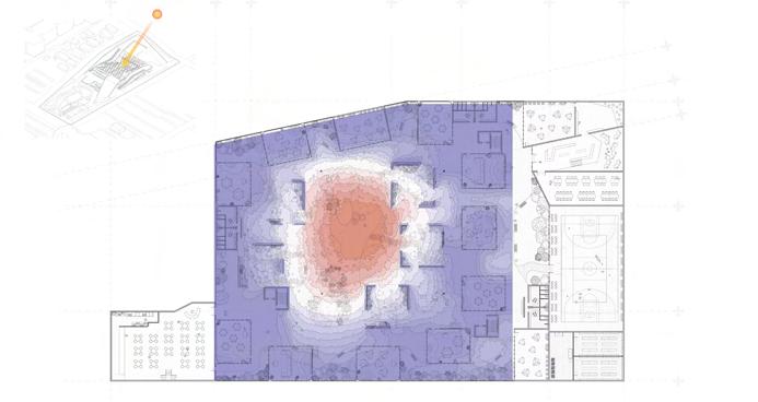 Low-light areas are assigned to circulation, auxiliary spaces, and shade-tolerant planting, preserving high-quality daylight for primary learning spaces.