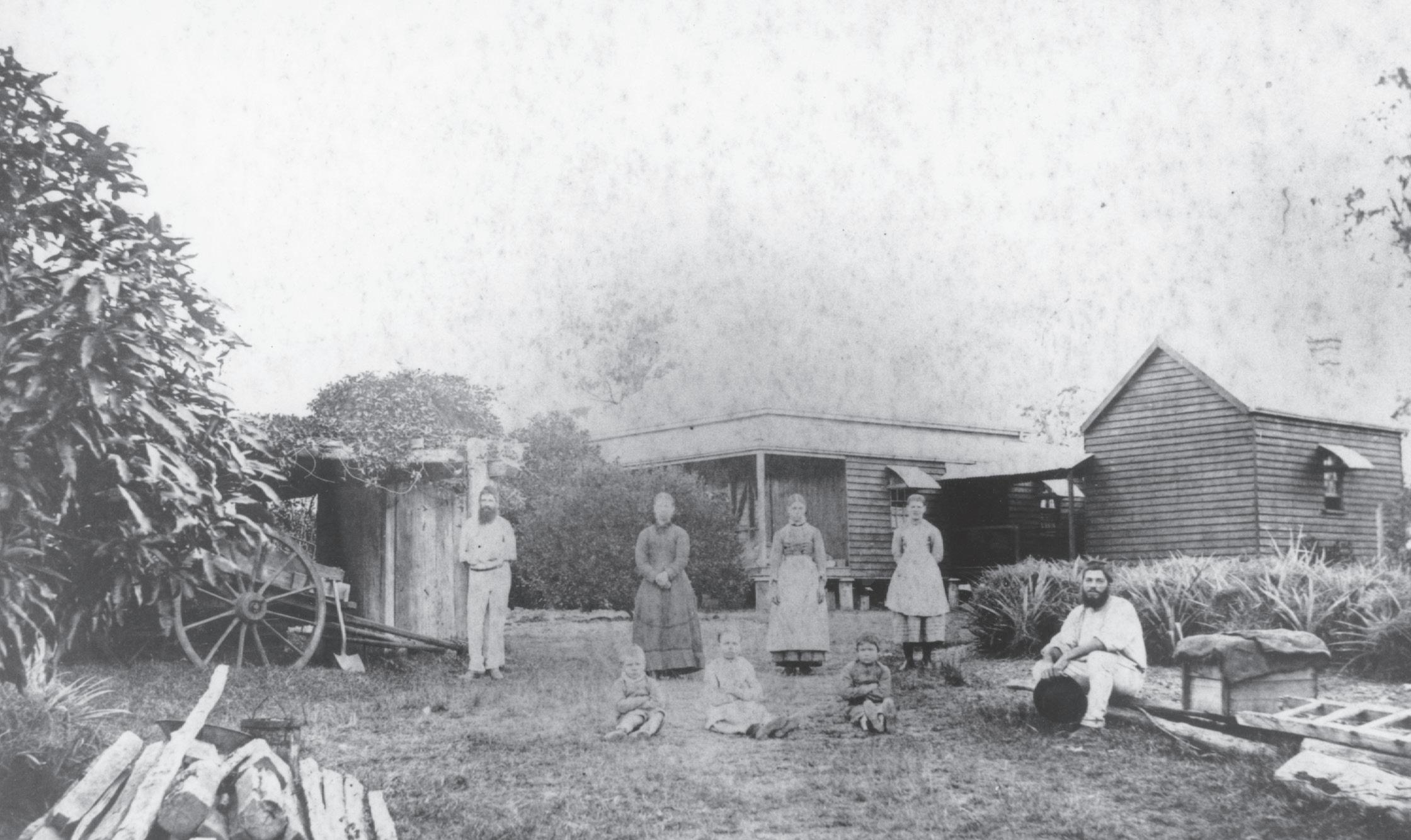Main photo: Mayes Family in 1887. Photo on top right: Scrubby Creek 1872