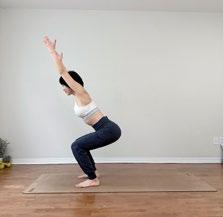 STEP 1. 선자세에서 손을 머리 위로 뻗고 엉덩이를 뒤로 보내며 투명의자에 앉습니다.