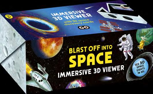 Choose a space card and place it in the box, then look through the lenses to blast off on your out-ofthis-world adventure! See Mars Rover on the red planet, the International Space Station in orbit around the Earth, the mesmerising Milky Way and many other interstellar favourites in three dimensions. Turn over the cards to discover fun facts about each amazing object and innovation.