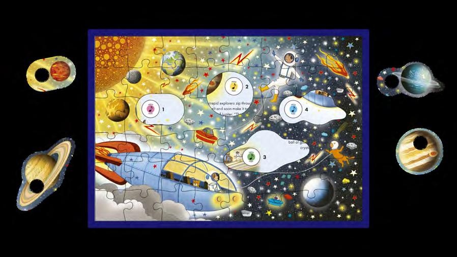 Begin with a musical tray that tells the story of two children on a magical journey through space. Using the full puzzle image on the poster as a reference, piece together an enchanting illustration showing a brother and sister speeding through The Planets on an out-of-this-world adventure. As you slot the shaped pieces into place, press the musical notes to hear the vivid sound of an orchestra playing from Holst's original score. This musical jigsaw puzzle is the perfect gift to introduce children to classical music.