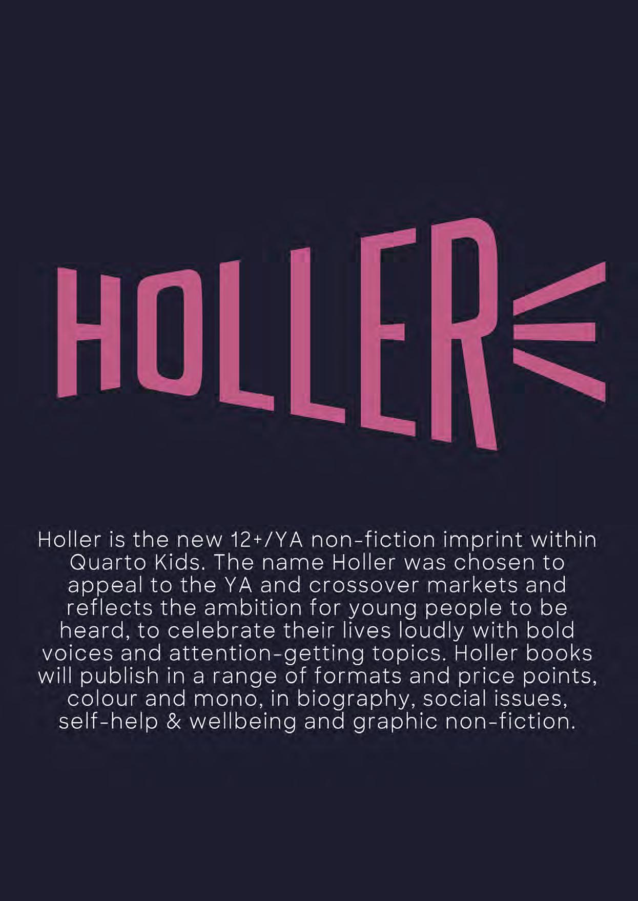 Holler is the new 12+/YA non-fiction imprint within Quarto Kids. The name Holler was chosen to appeal to the YA and crossover markets and reflects the ambition for young people to be heard, to celebrate their lives loudly with bold voices and attention-getting topics. Holler books will publish in a range of formats and price points, colour and mono, in biography, social issues, self-help & wellbeing and graphic non-fiction.