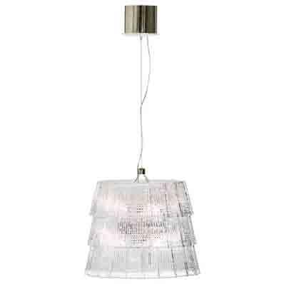 3 module Classic version with halogen light. Each module consists of 42 large spiked prism crowns with satin like grooves on one side and 42 small spiked prisms. A structure in polished stainless steel (satinlike grooves along prisms, pattern on the top reflecting in the mirror), welcome the lighting system. Mirrored canopy with a stainless steel polished chrome edge. 9 stainless steel adjustable cables (3 m maximum) and a transparent electrical wire running along one of the steel cables on each module.