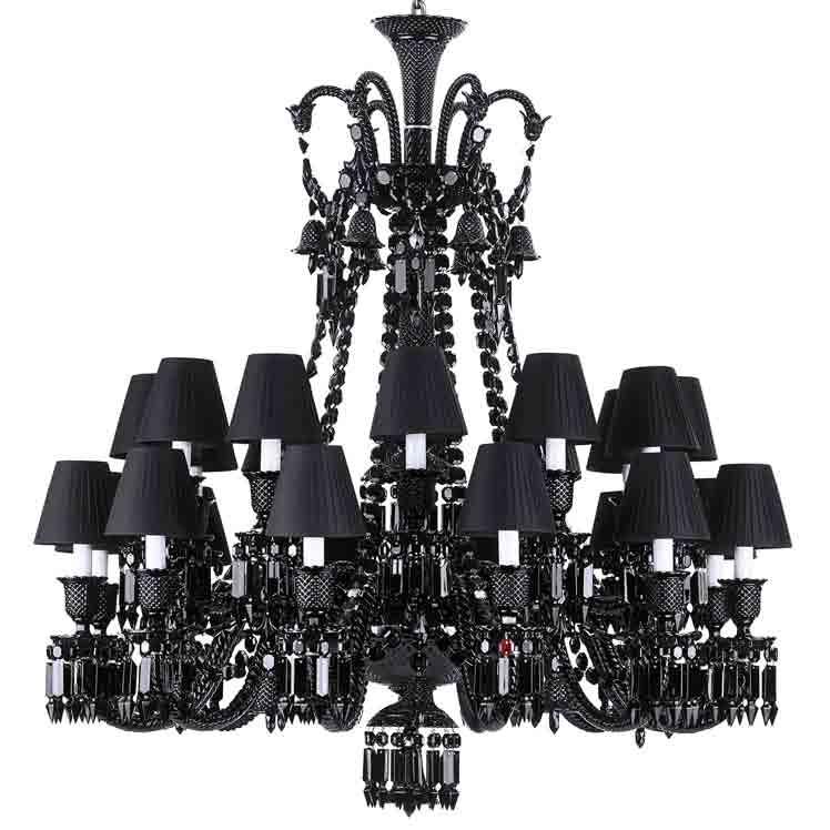 Structure and ornamentation identical to the traditional Zenith chandelier. A red crystal octagon represents the Baccarat signature and is linked to a spiked prism designed by Starck. Two options for displaying your chandelier - with or without black lampshades lined with aluminum reflectors that magnify the effect of light on the black crystal.