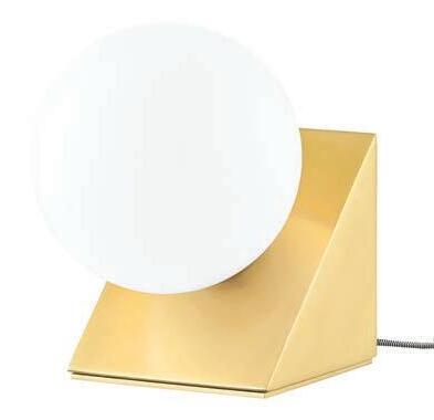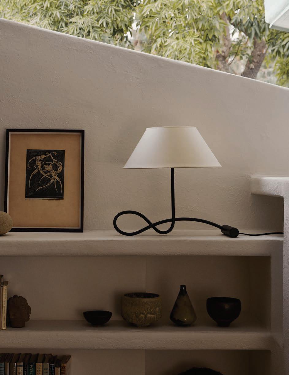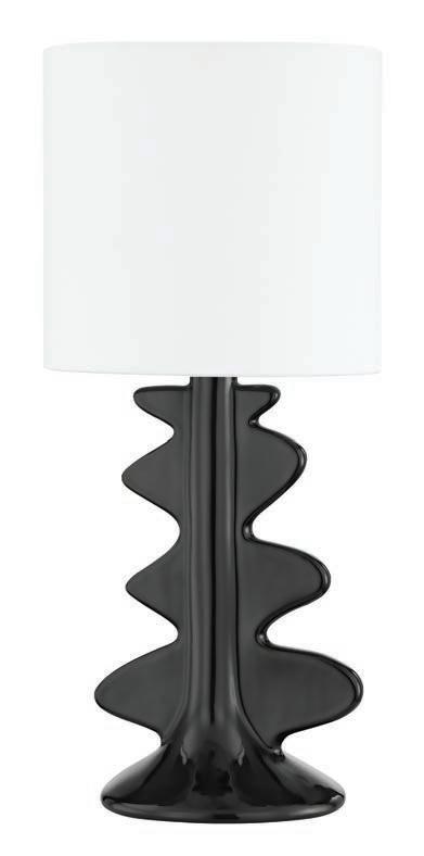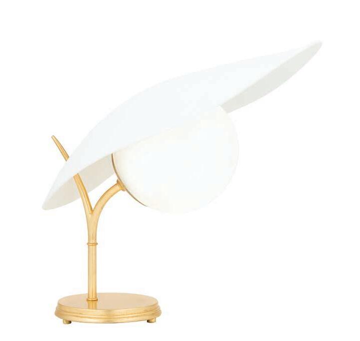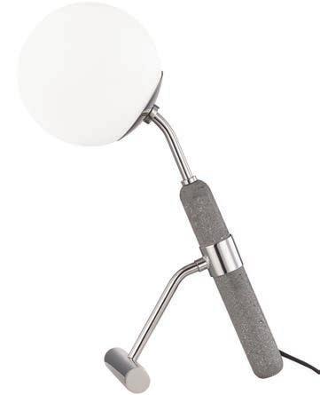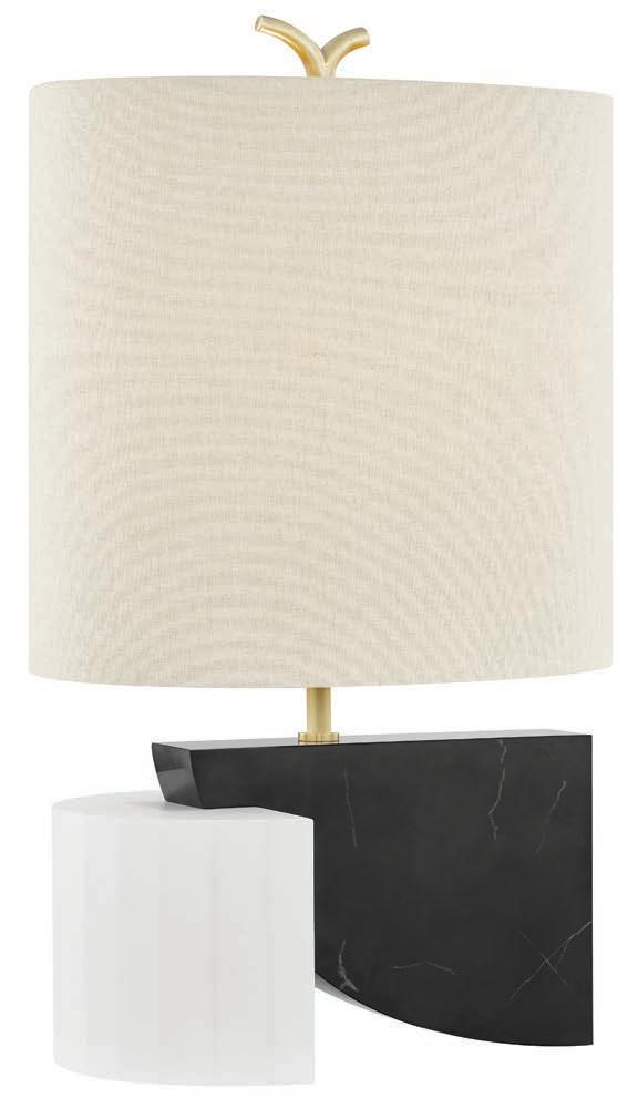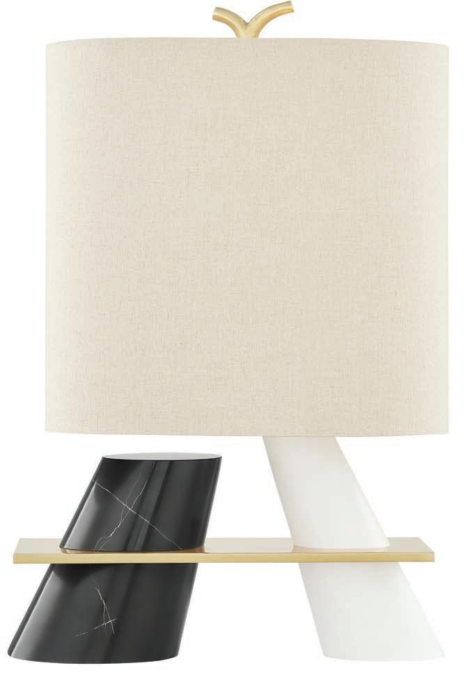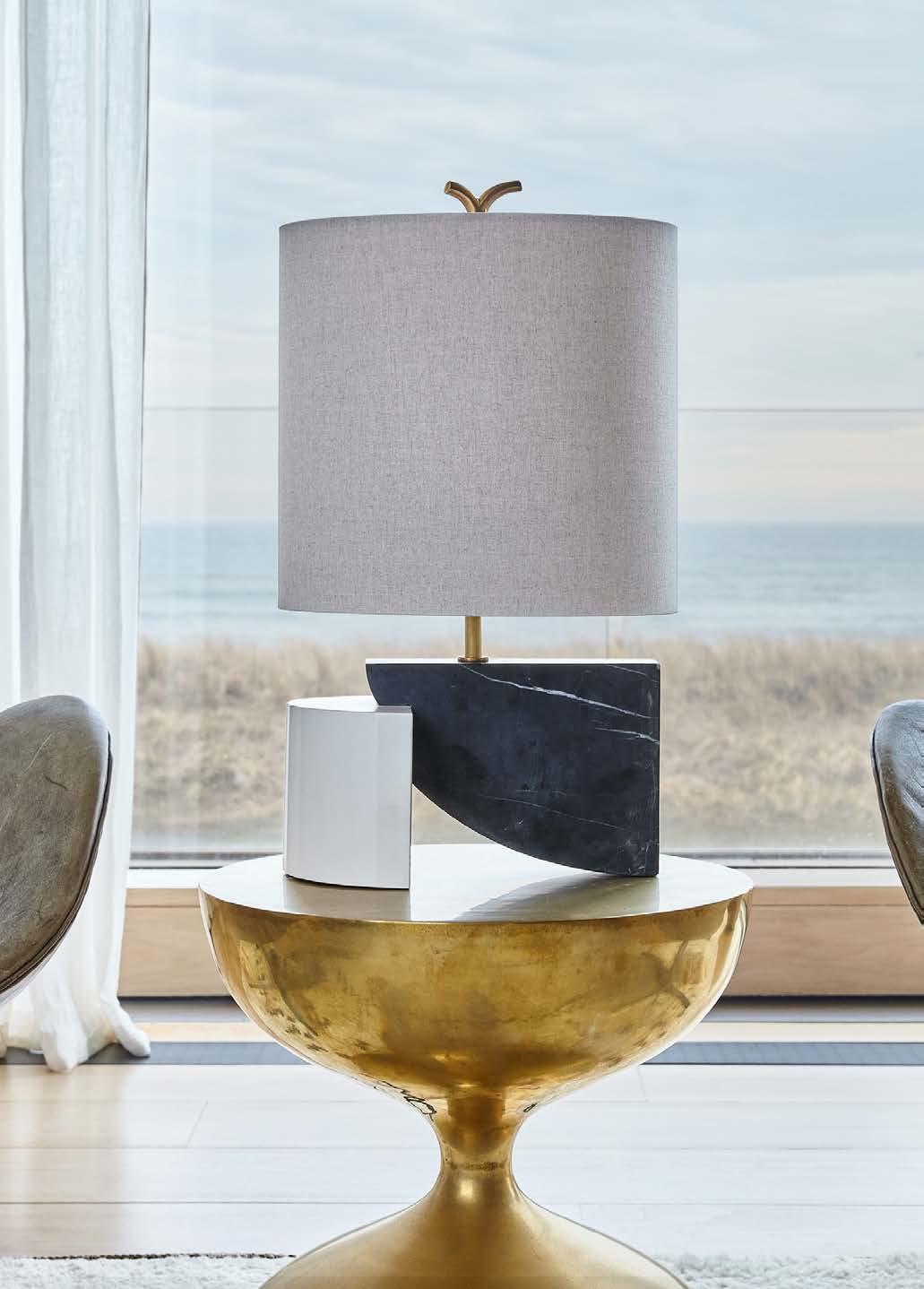 Of the belief that table lamps should hold their own in a room, Kelly Behun’s Traverse has a strong sculptural quality. Its quarter-inch brass plate appears to slice through the light and dark forms of honed Nero Marquina marble and cream ceramic and metal,