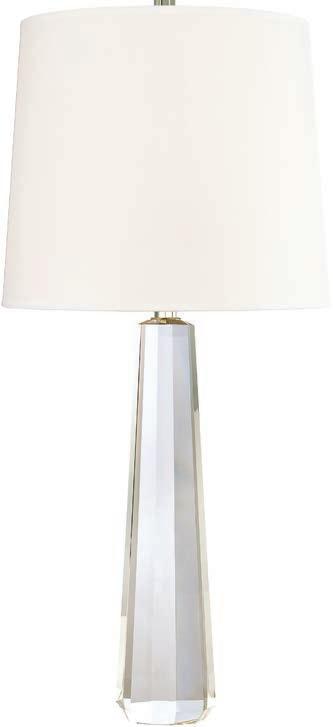 24 25 ITEM W H BASE SHADE MATERIAL BULBS FINISHES L1846 17.75" 28” 6"L x 4.5"W (17" x 9.25")T x (17.75" x 10")B x 11.75"H Belgian Linen 1 75 w/m Not Included Aged Brass/Golden Olive Ceramic (AGB/CGO) Aged Brass/Sage Ceramic (AGB/CSG) Solid brass full-range dimmer socket. UTICA L1846-AGB/CGO L1846-AGB/CSG HENLEY L1038-AGB L1035-AGB ITEM D H BASE SHADE MATERIAL BULB FINISHES L1035 9.5” 13.5” 4.25”D 7.5”T x 9.5”B x 8”H Belgian Linen 1 75 w/m Not Included Aged Brass (AGB) L1038 13.5” 17.5” 5.5”D 11”T x 13.5”B x 9.5”H Belgian Linen 1 100 w/m Not Included HAGUE L1056-PN L1058-PN ITEM L W H BASE SHADE MATERIAL BULBS FINISHES L1054 – 10” 14” 5.75”D 9”T x 10”B x 8”H Belgian Linen 1 60 w/m Not Included Polished Nickel (PN) L1056 19” 7.5” 14.75” 14”L x 3.25”W (18 x 6.5”)T x (19 x 7.5”)B x 8.5”H Belgian Linen 2 60 w/m Not Included L1058 16” 9” 27” 4.75”SQ (15 x 8”)T x (16 x 9”)B x 10.5”H Belgian Linen 1 100 w/m Not Included L1054-PN
