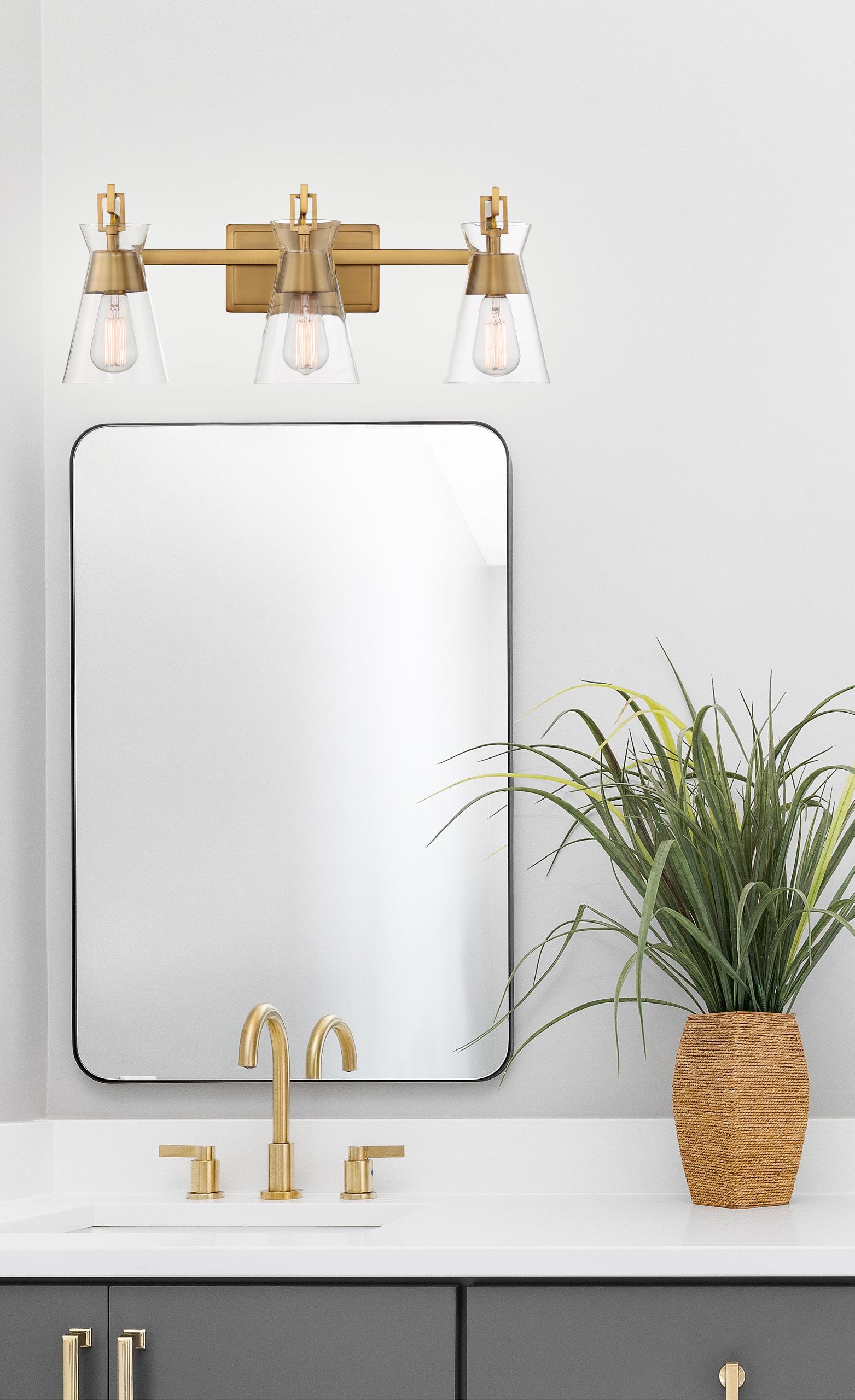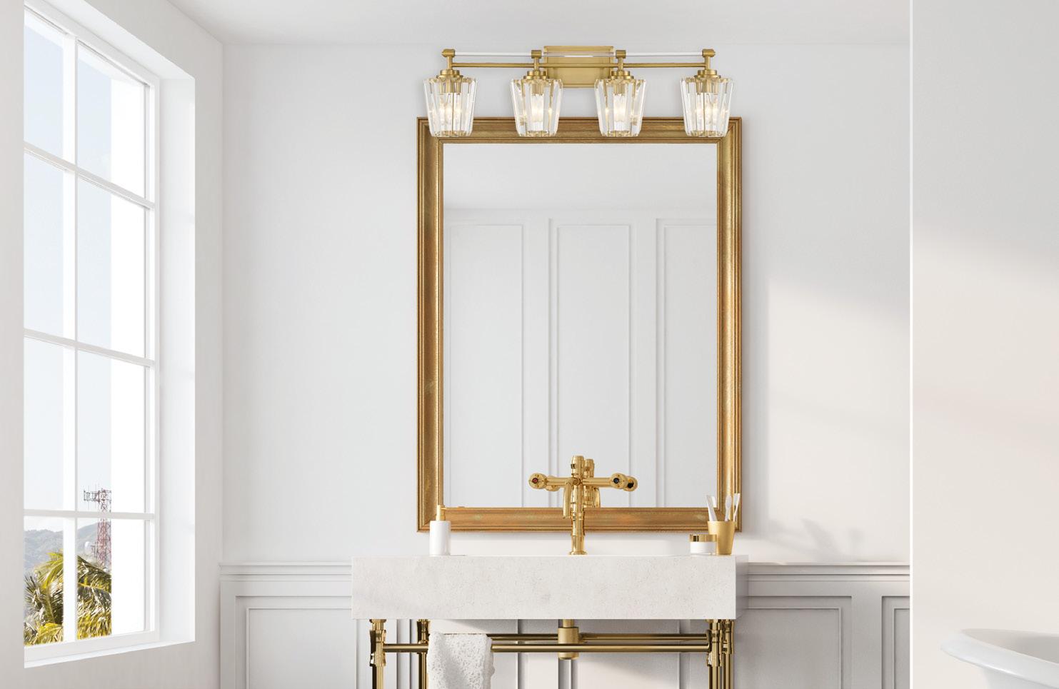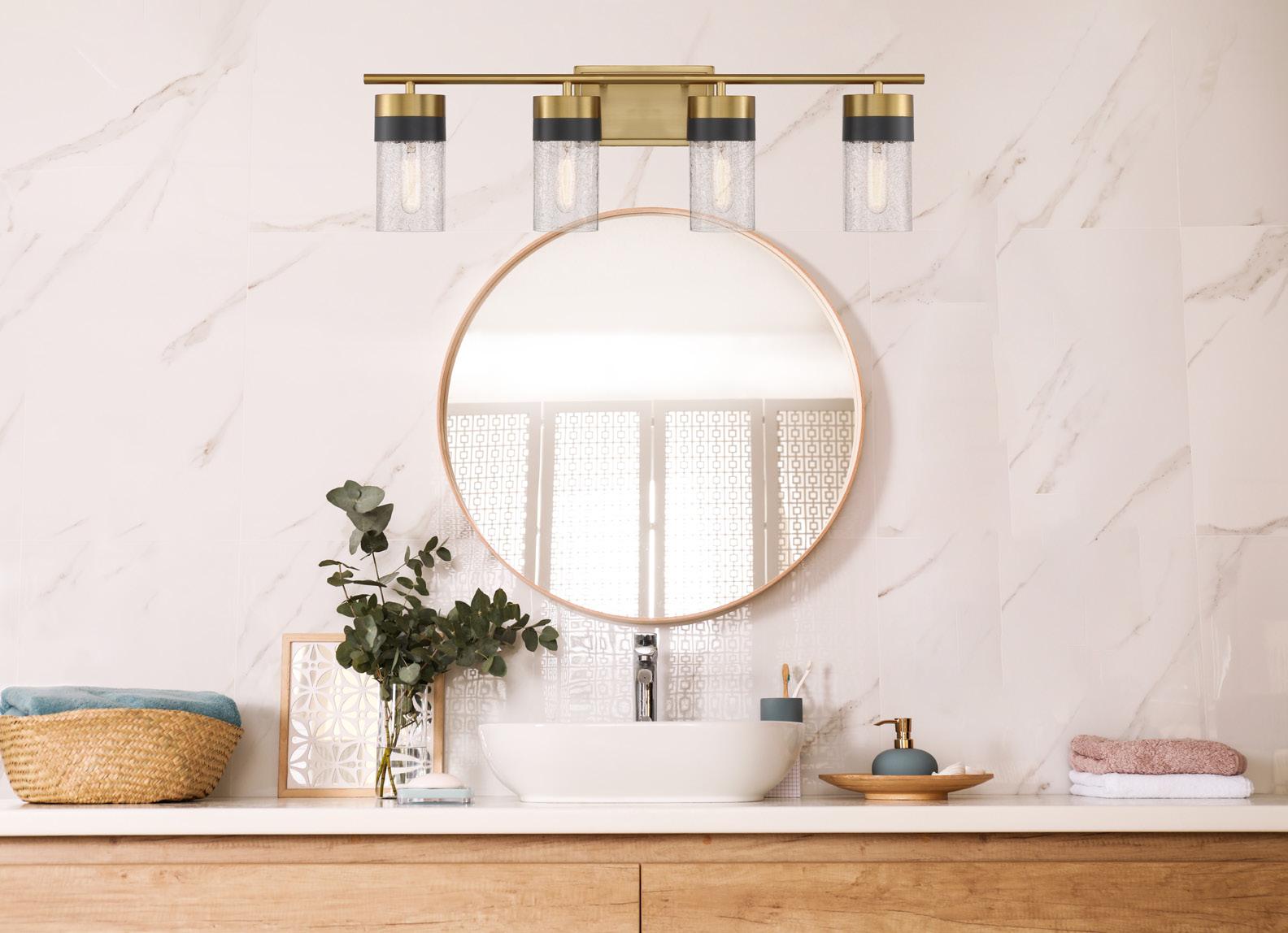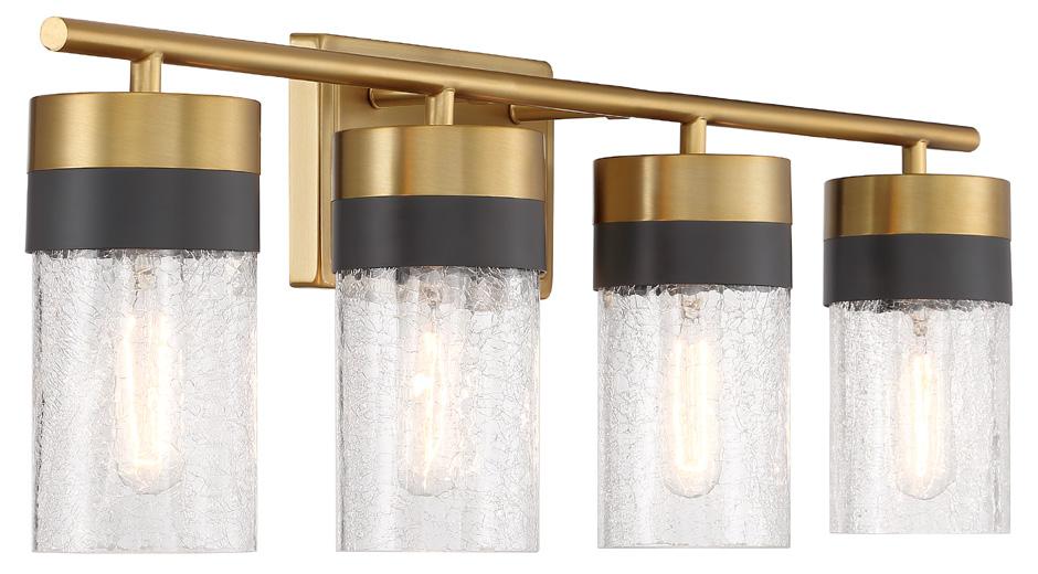 From top to bottom, Brickell is designed to make any bathroom a standout space. Its classic pairing of warm brass and black is made even better with the addition of textural clear crackled glass shades.